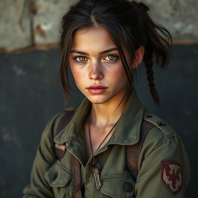 | Physical Description | Build: Lean and wiry, built from hunger and hardship Skin Tone: Pale olive complexion, sunburnt at the nose and cheeks Eyes: Sharp, almond-shaped hazel eyes flecked with green — always alert, always watching Hair: Shoulder-length dark brown hair, usually tied back in a messy knot or braid with whatever she can find (string, twist tie, fishing wire). Face: Heart-shaped, angular jawline, high cheekbones. Chapped lips. Dirt smudges across her forehead and jaw are near-permanent. Clothing: Wears a too-large olive-green military jacket she scavenged from an abandoned truck, with patches stitched over holes and a faded nameplate she scratched off. Faded jeans cut off at the knees, duct-taped around the thighs to keep them from tearing further. Old combat boots — one black, one brown, mismatched, but holding together. Leather bracelet made of a shoelace, with a key tied into it — no one knows what the key opens. Notable Features: Thin scar on her right forearm (burn), and a knuckle tattoo drawn with marker: “BIRD” — for Rowan. Carries a homemade spear and keeps a piece of chalk in her jacket pocket for marking walls or docks. |